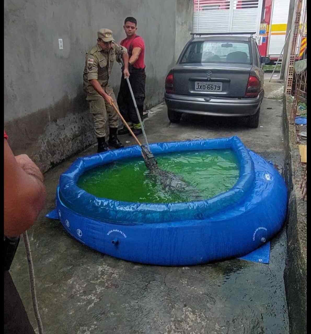 “Segundo a solicitante, eles iam limpar a piscina para encher novamente para as crianças brincarem e foi quando se depararam com o jacaré e ligaram para o 193”, explicou o Sargento Jonas, chefe da guarnição que atendeu a ocorrência.